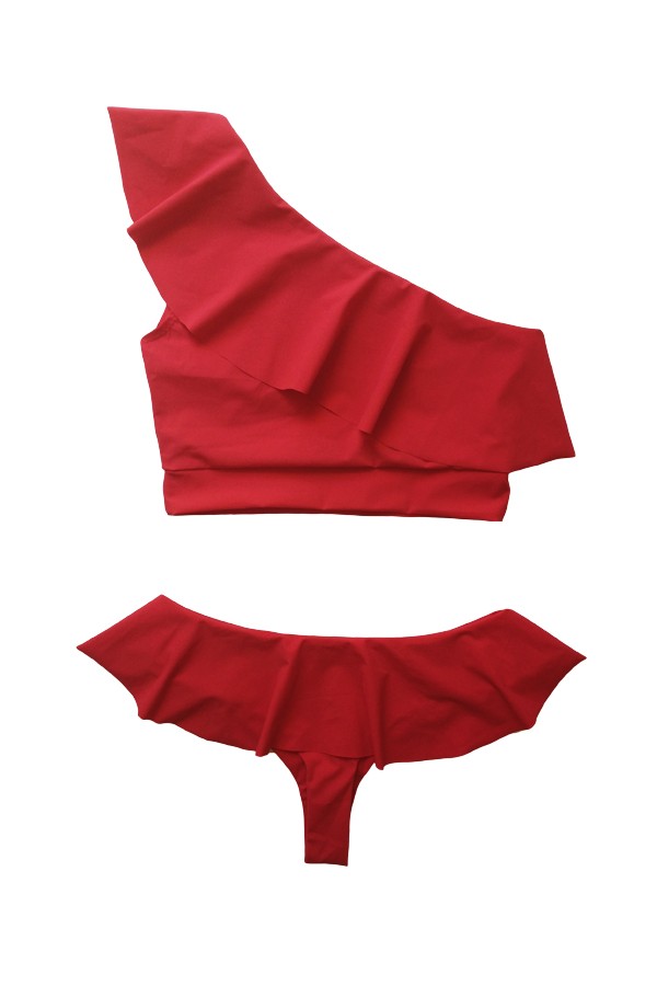 Destaca con este bikini de top con un solo hombro y volados, que aporta un toque romántico y elegante. Combínalo con los bottoms a elección, disponibles en Culotte o Tanga, ambos con volados para un look coqueto y favorecedor, perfecto para lucir segura y cómoda en la playa o piscina.