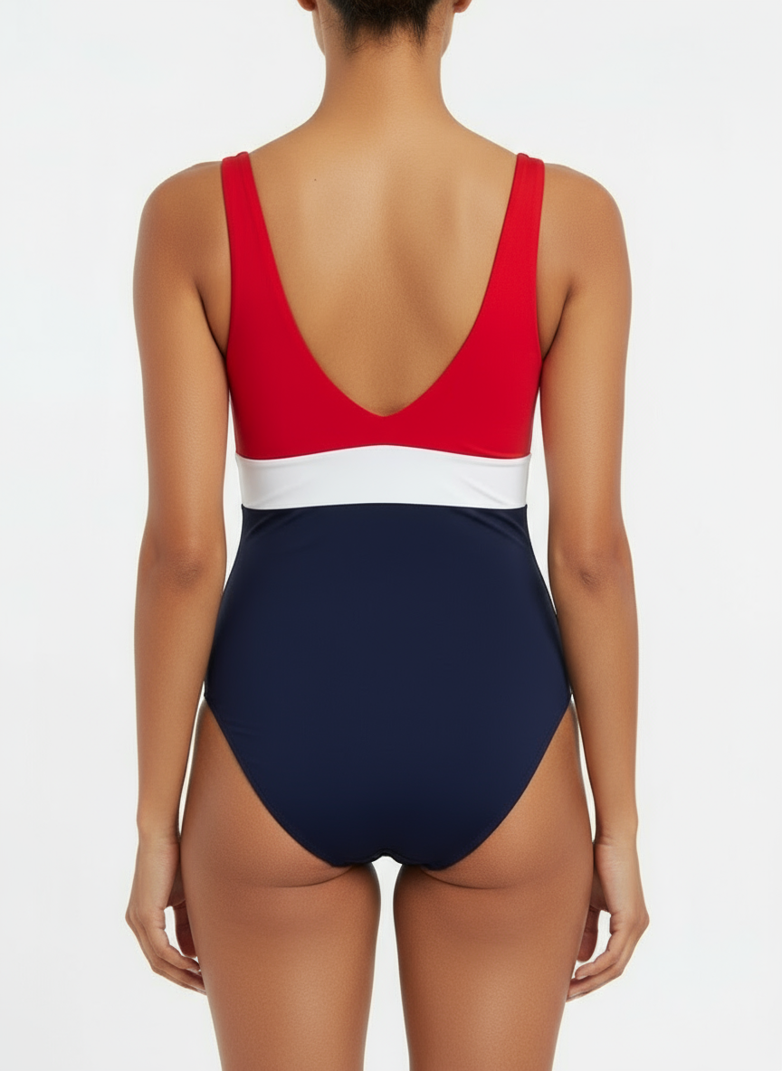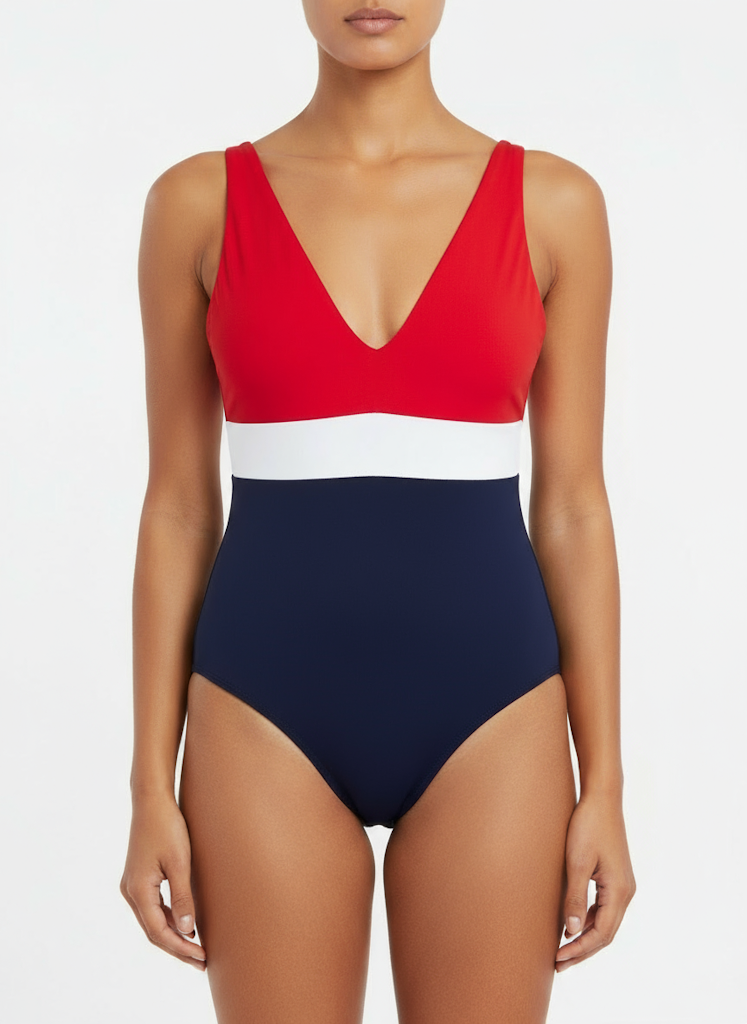 Este Traje de Baño Hadid combina estilo y comodidad en un solo diseño. Con escote en V y bloques de color rojo, blanco y azul marino, realza la silueta y ofrece un ajuste favorecedor, ideal para disfrutar del sol con confianza y elegancia.