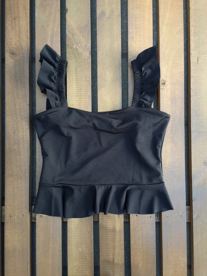 Este top destaca por su diseño con volados que aporta un toque coqueto y elegante. Los breteles aseguran un ajuste cómodo y seguro, mientras que la Lycra Dupont se adapta suavemente al cuerpo, ofreciendo confort y libertad de movimiento.