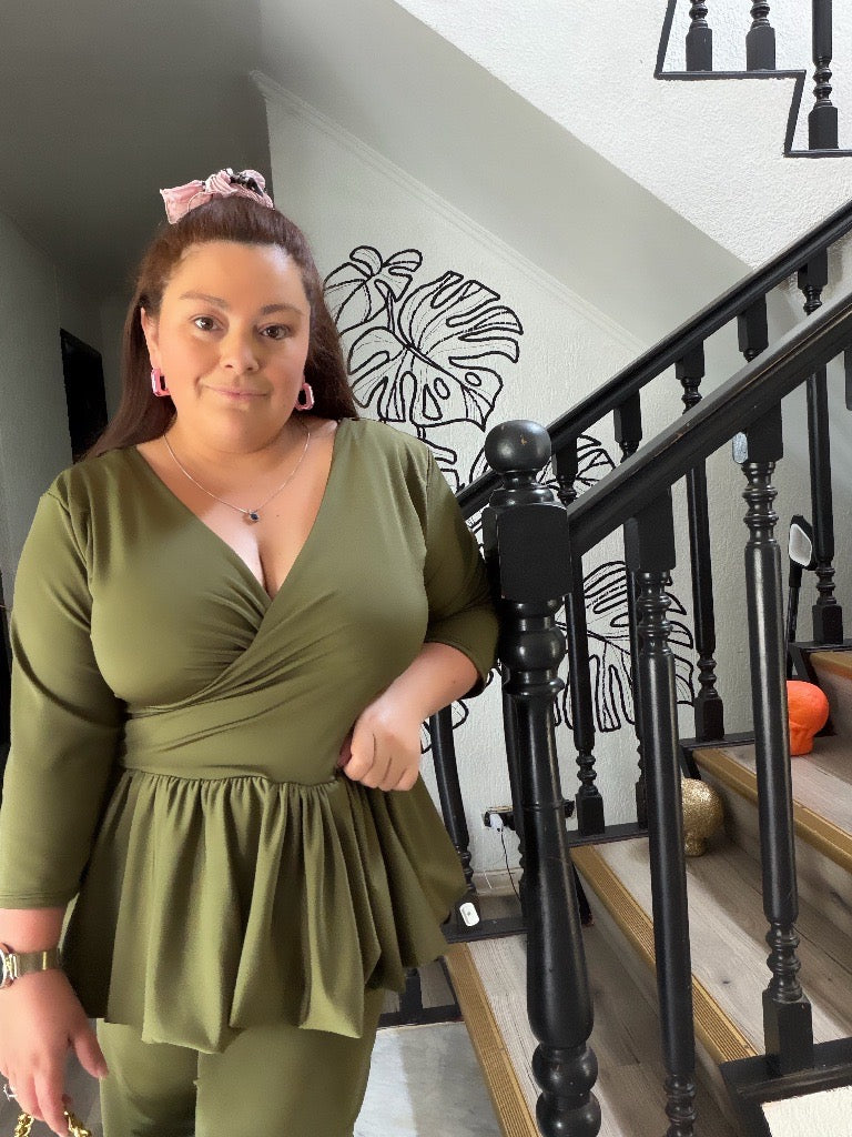Polera cruzada con faldón globito, manga 3/4 + pantalón Palazzo corte perfecto con tiro alto y pretina ancha sin elástico