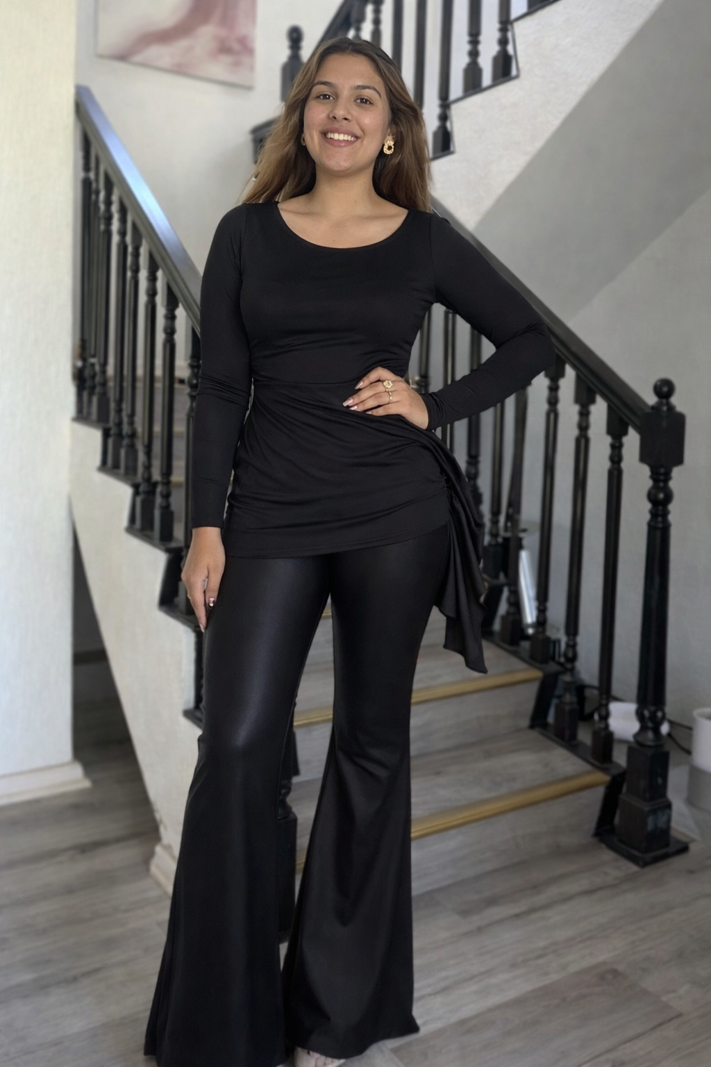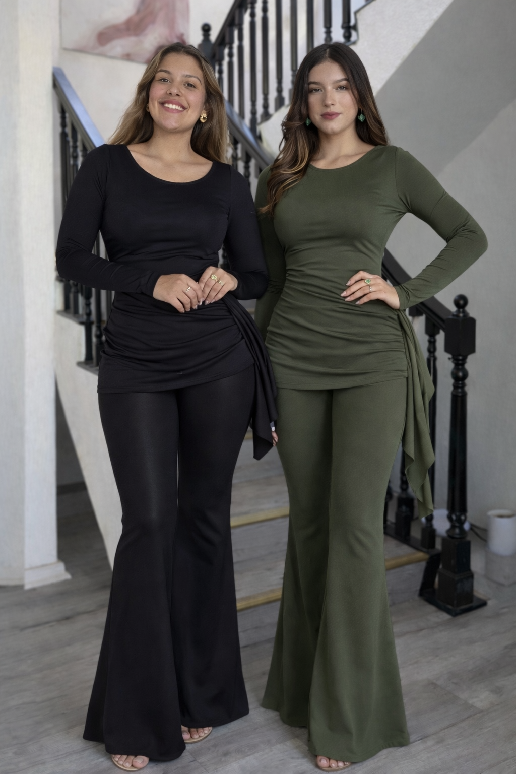 Su diseño incluye un top de manga larga con escote redondo y fruncido lateral que ayuda a estilizar la silueta, junto a un pantalón maxi flare que alarga visualmente las piernas y crea un look equilibrado y elegante.