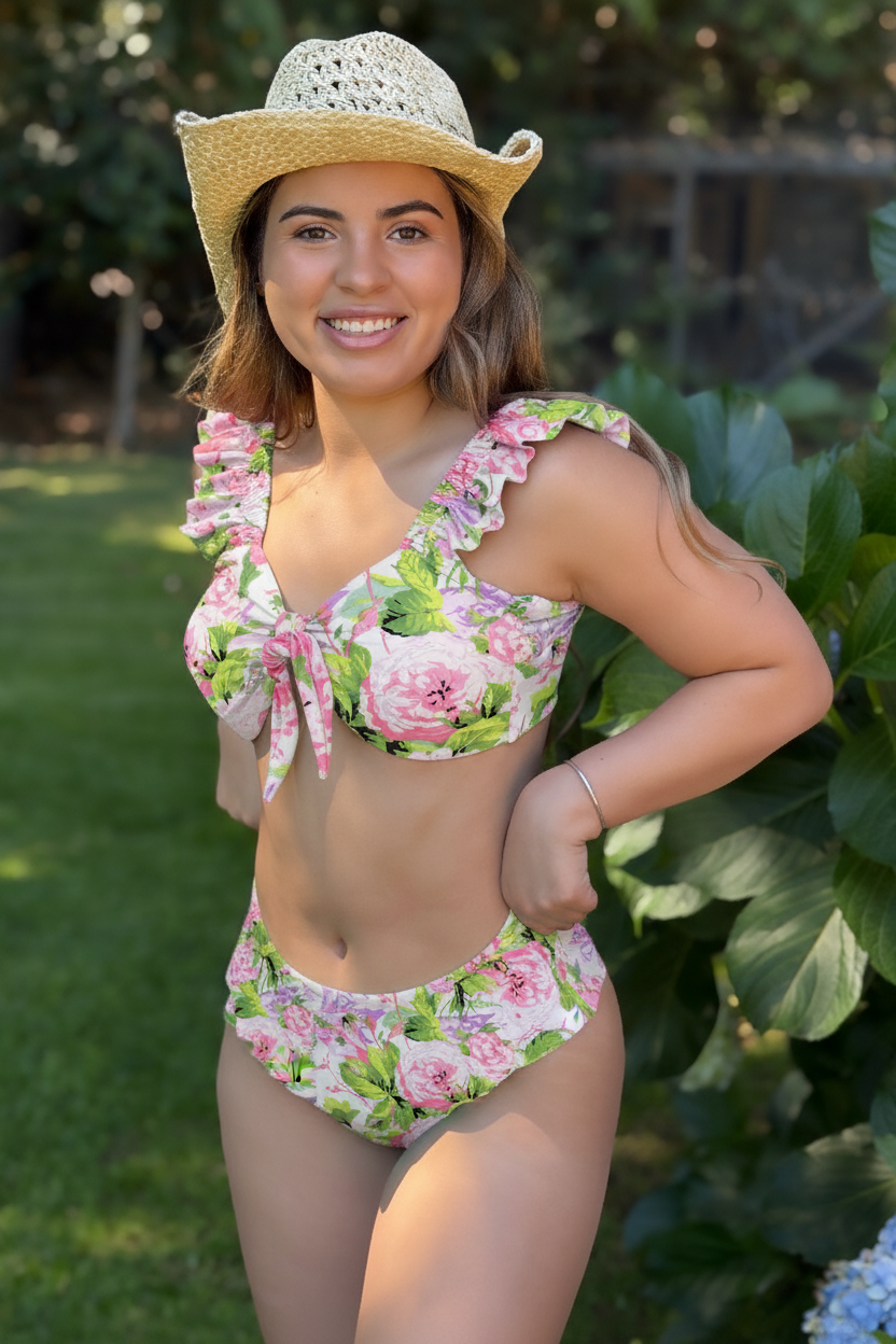 Destaca con este bikini de diseño sofisticado: el top con amarras en la espalda y breteles elásticos con relleno brinda soporte y ajuste perfecto, mientras que el calzón tiro alto con doble vuelo simula una falda, aportando un toque coqueto y estiloso. Perfecto para lucir femenina y sentirte segura en la playa o la piscina.