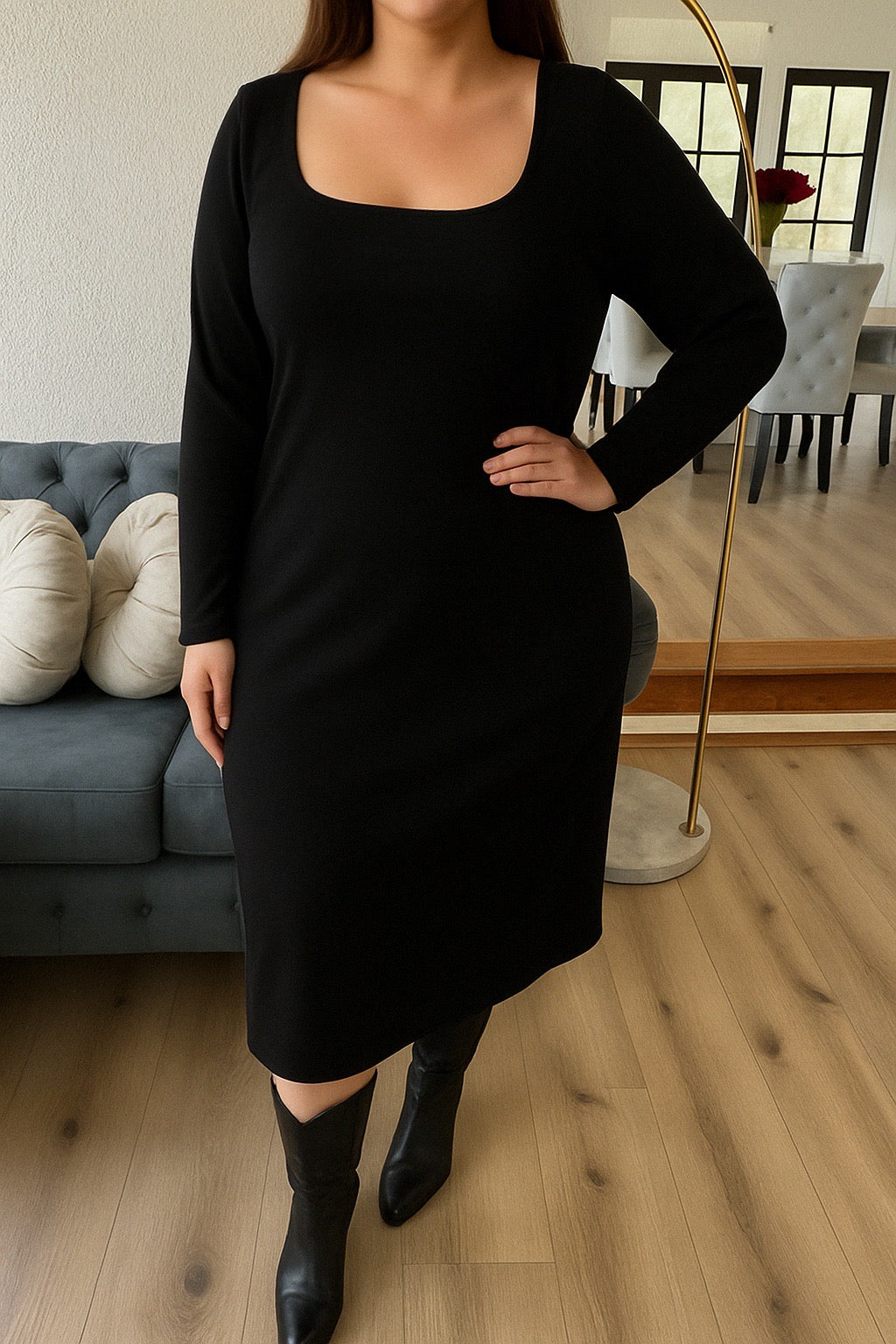 Luce un look elegante y sofisticado con este vestido largo ajustado, diseñado con escote cuadrado que resalta la silueta de manera femenina y moderna. Confeccionado en scuba crep, ofrece estructura, confort y calce perfecto, ideal para destacar en cualquier ocasión especial.